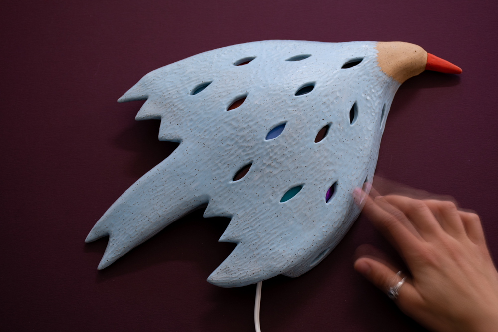 Let them fly est un oiseau lumineux tout droit sortit d’un rêve lors d’une nuit de pleine lune lors de mon séjour à Seattle (USA), chez l’artiste céramiste Emily Counts. Après avoir travaillé pour elle et ses projets, j’ai pu moi aussi mettre les mains à la pâte.