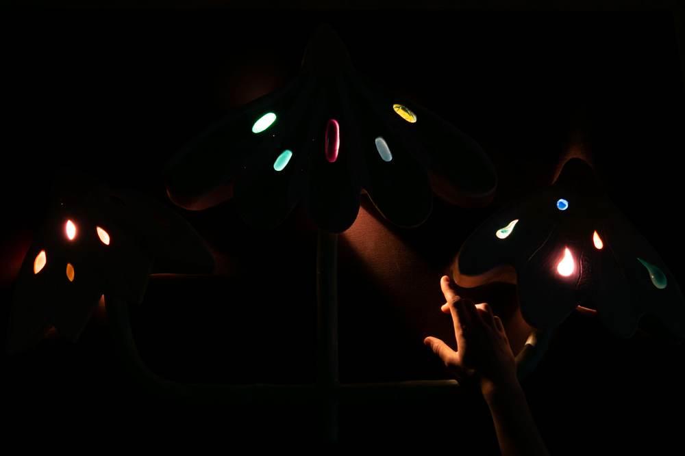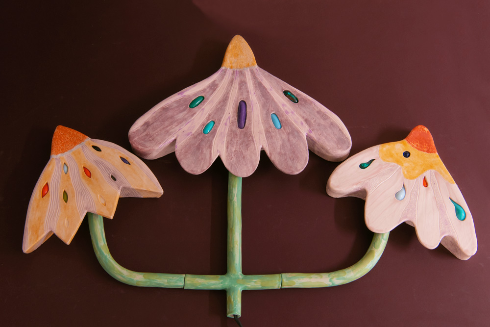 J’ai voulu ici le remettre au goût du jour (et à ma façon!), avec Même les plus belles fleurs finissent par faner, en le dédramatisant avec des couleurs vives et des formes plus légères, rustiques et joyeuses pour en faire une installation murale.